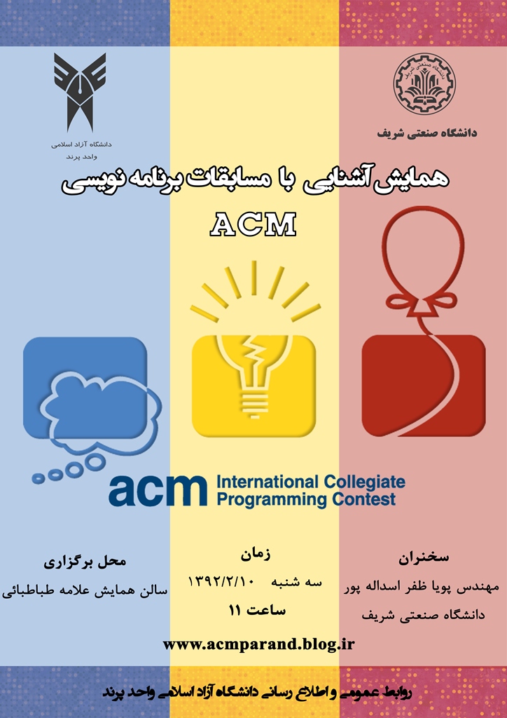همایش آشنایی با مسابقات برنامه نویسی ACM، روز سه شنبه مورخ 92/2/10 در سالن همایش علامه طباطبایی (طبقه سوم ساختمان کامپیوتر و فناوری اطلاعات) برگزار می گردد.