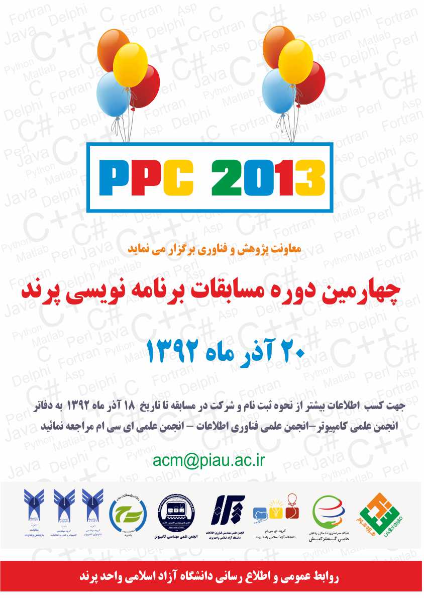 چهارمین دوره مسابقات سالانه برنامه نویسی پرند (PPC) روز چهارشنبه مورخ 1392/09/20 راس ساعت 9 صبح در سایت دانشکده کامپیوتر و فناوری اطلاعات برگزار خواهد شد.